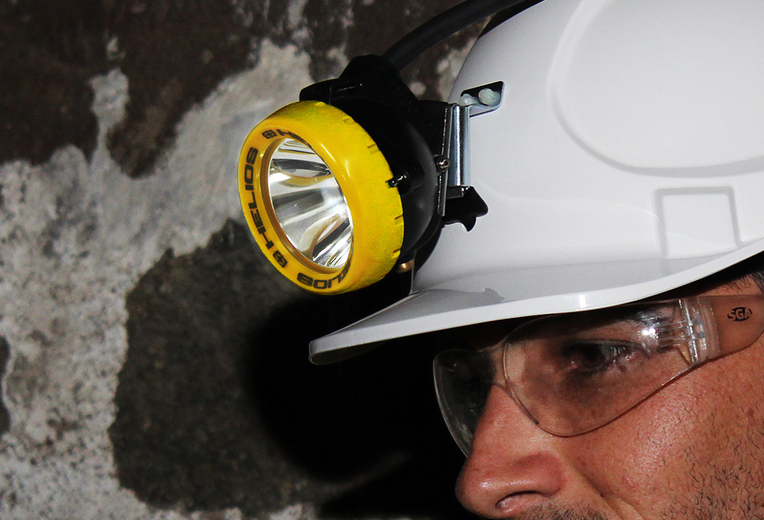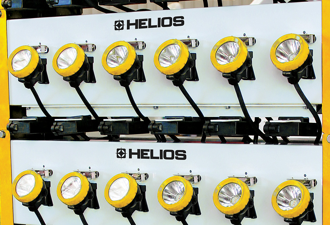 Las lámparas mineras HELIOS con cable se pueden recargar con nuestra línea patentada de estantes para cargadores HELIOS.